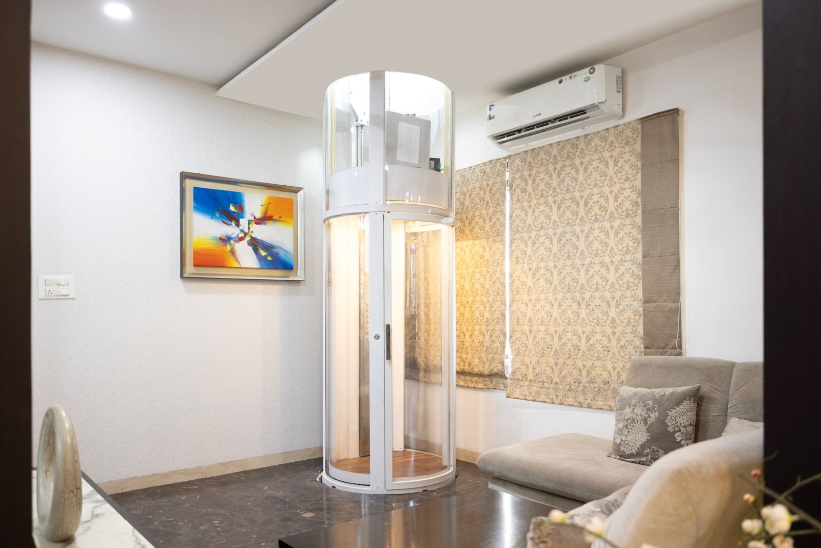 Elegant. Compact. Circular. Designed to impress and built to perform, the FLIT Icon Series 1 is a premium circular home elevator tailored for elegant interiors and space-conscious architecture. Its full polycarbonate cylindrical structure, paired with a durable powder-coated frame, offers a sleek, modern look that enhances any luxury space. Powered by advanced hydraulic technology, it ensures smooth, silent, and jerk-free travel, making it the perfect lift solution for villas, duplexes, and upscale residences where both design and functionality matter.